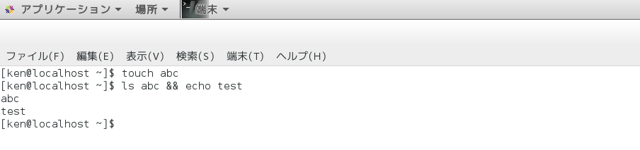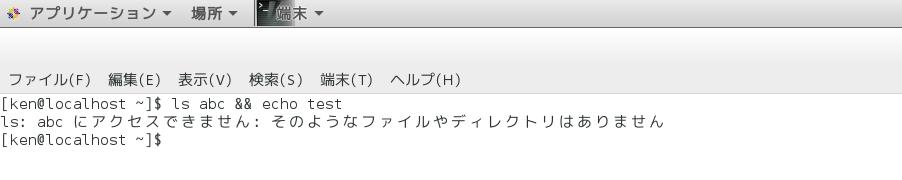 意図的に存在しない「abc」というファイルを「ls」コマンドで表示しようとしてみるが、エラーとなる、「&&」を指定している場合次のコマンドは実行されない