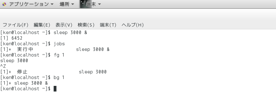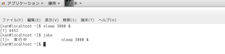 「jobs」コマンドを実行すると現在ユーザが設定したジョブ一覧が表示される