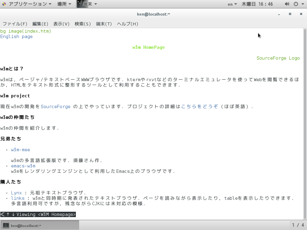今回のなかでは唯一CUI環境で動作するブラウザである。現東北大学教授、伊藤彰則氏が開発したテキストブラウザである。CUIな環境で動作するため、テキストを中心としたブラウザとなるが、タブブラウジング、マウスによる操作、テーブル、フレームの描写などが可能となっており、画像ファイルをインライン表示することも可能となっている。