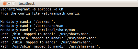 Ubuntuのマニュアルページを使用し索引データベースからCDを検索し、コマンド名を調べるする場合は、次のコマンドだ。