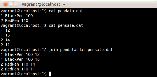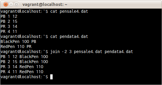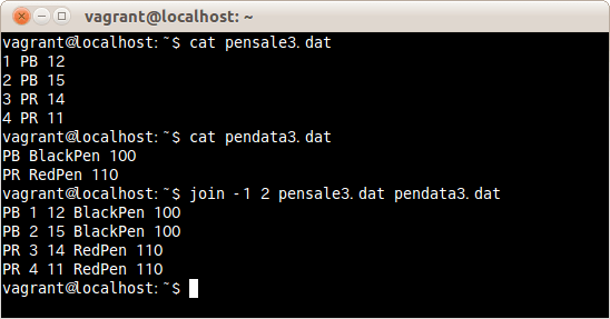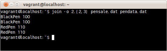 出力するフィールドを2つめのファイルの2つめと3つめのフィールドを指定しファイルpensale.datとpendata.datを結合する場合は、次のコマンドだ。