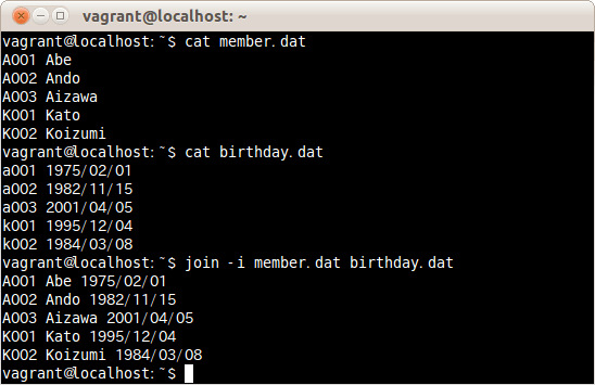 項目名を検索する時大文字と小文字を区別せずにファイルmember.datとbirthday.datを結合する場合は、次のコマンドだ。