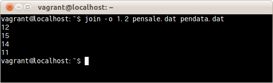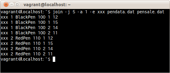 出力するフィールドを1つめのファイルの1つめのフィールドと2つめのファイルの3つめのフィールドとを指定しファイルpensale.datとpendata.datを結合する場合は、次のコマンドだ。