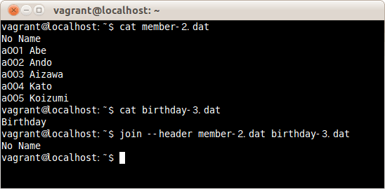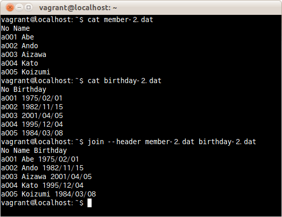 ファイルの1行目はフィールド名として扱いファイルmember-2.datとbirthday-2.datを結合する場合は、次のコマンドだ。