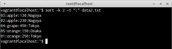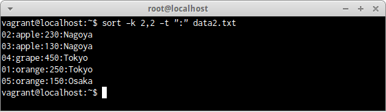 ファイルdata2.txtを「:」で区切り、2項目目の品名で並べ替えする場合は、次のコマンドだ。