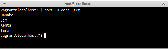 ファイルdata3.txtの中から重複データを削除し、並べ替えする場合は、次のコマンドだ。
