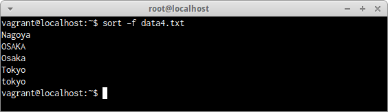 ファイルdata4.txtを大文字小文字を区別せずに並べ替えする場合は、次のコマンドだ。