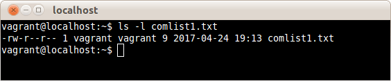 上で指定したファイル「comlist1.txt」をlsコマンドのlオプションで実行権限を確認する。