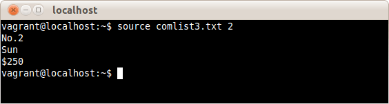 $ source comlist3.txt 2商品番号2の商品情報をsourceコマンドで表示する。