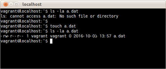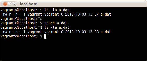 はじめは存在しなかったファイルa.datのタイムスタンプがtouchコマンド実行後に新規作成された。