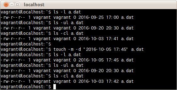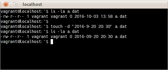 はじめは10月3日13:58だったファイルa.datのタイムスタンプが上記コマンド実行後、9月20日20:30に変更になった。