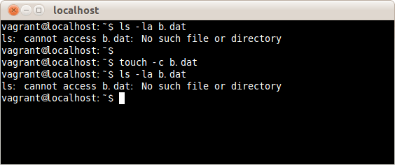 オプションなしでは指定したファイル名のファイルがなければ新規作成するが、-cオプションを指定すれば新規作成は行わない。