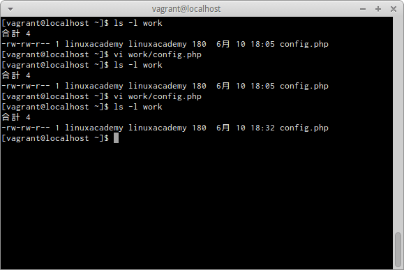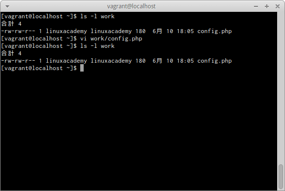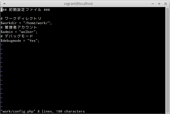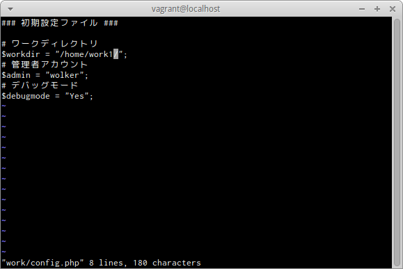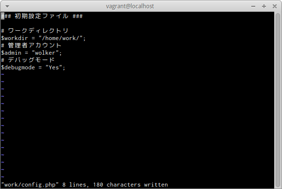 確認のメッセージ「"work/config.php" 8 lines, 180 characters written」のようにファイル名と書き込んだ行数と文字数が表示される。