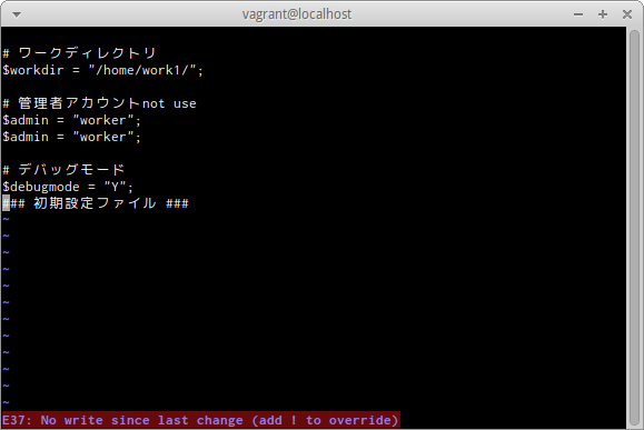 今回は変更があったので、「E37: No write since last change (add ! to override)」の警告が表示され、viエディタが終了しない。