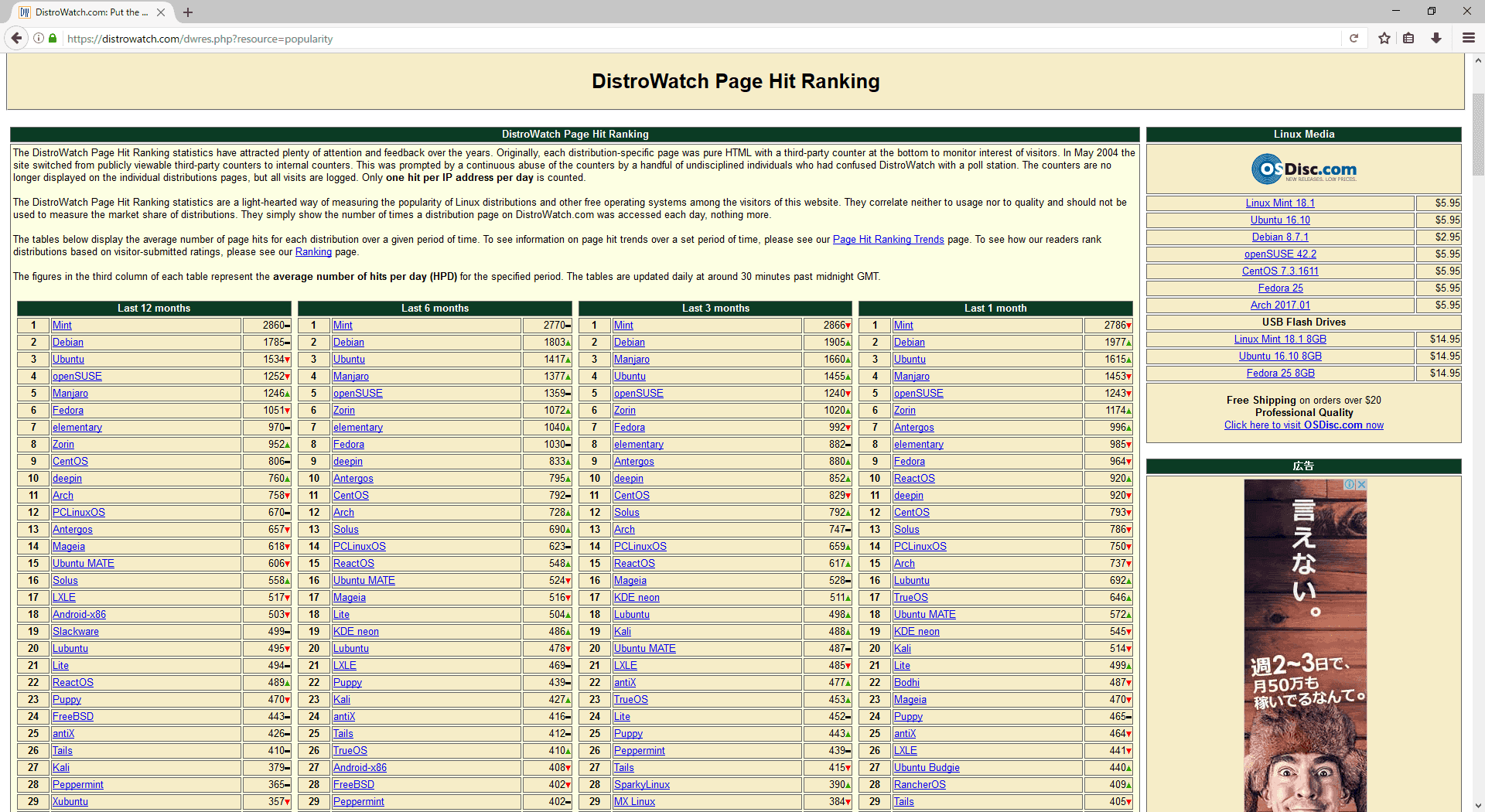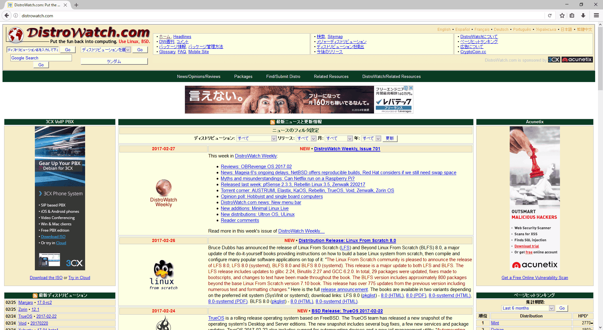 「いまどのディストリビューションが人気なのか?」「ぱっとお勧めは?」そういった要望にこたえてくれるのが「distrowatch」というサイトだ。