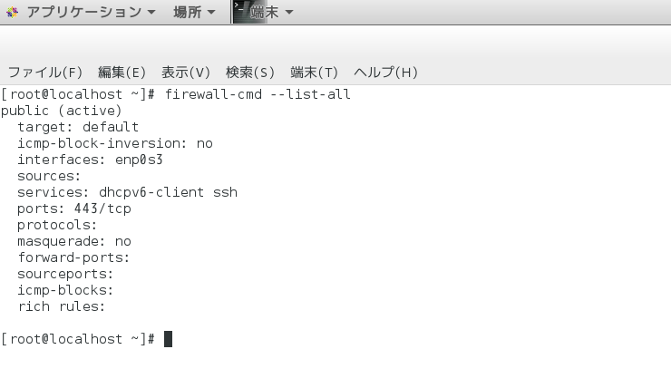 enp0s3はパブリックゾーンに属し「dhcp6-client」と「ssh」がサービスとして許可されている。ほか443/tcpポートが開放されている状態となっている。