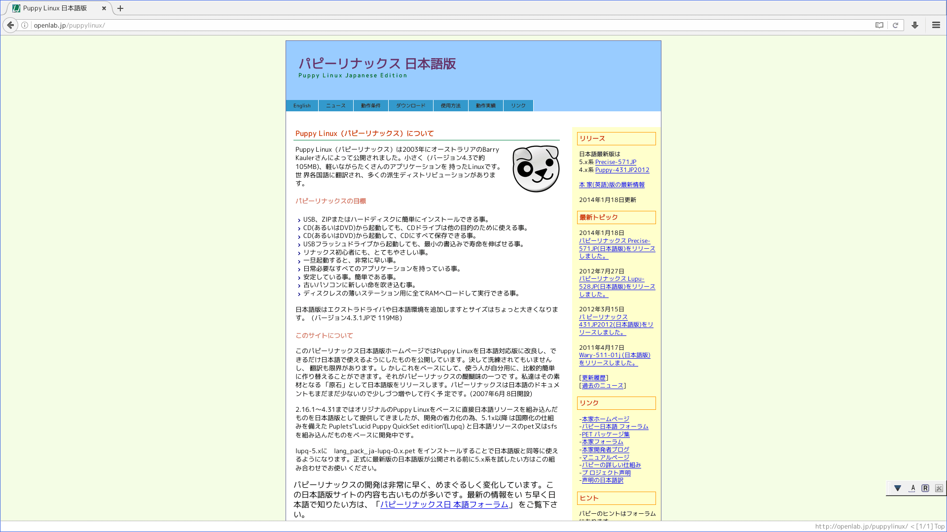 「Puppy Linux 日本語フォーラム」を訪れてください。非公式ながら、Ubuntu Tahr ベースの Tahrpup 6.0.5 を日本語化した派生版もあります。