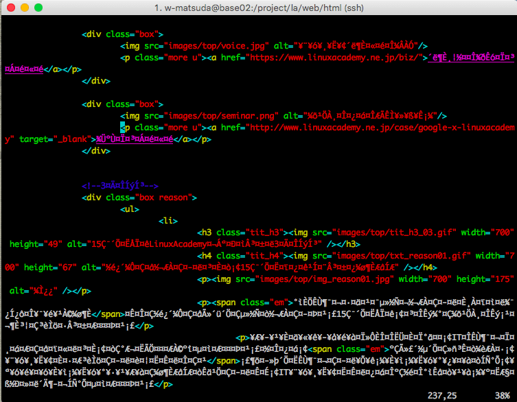 文字コードが不一致な環境でテキストデータを開くと「文字化け」をひきおこす。下記のようにviでファイルを開いても読めないことが起こるわけだ。何が書いてあるかまったくわからない。