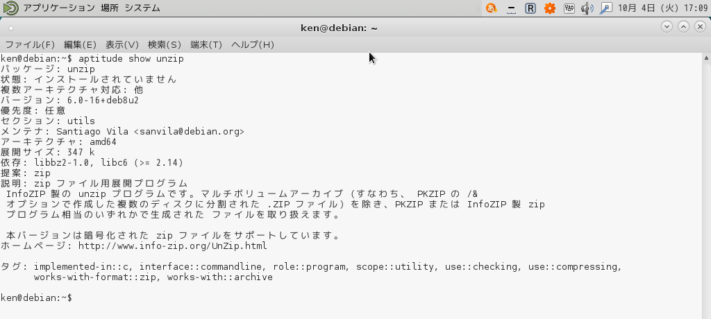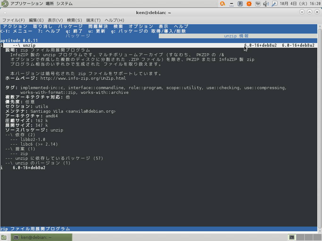 「unzip 情報」というタブが出来上がり情報が表示されるはずだ。タブを閉じるときは「q」を押せばよい。