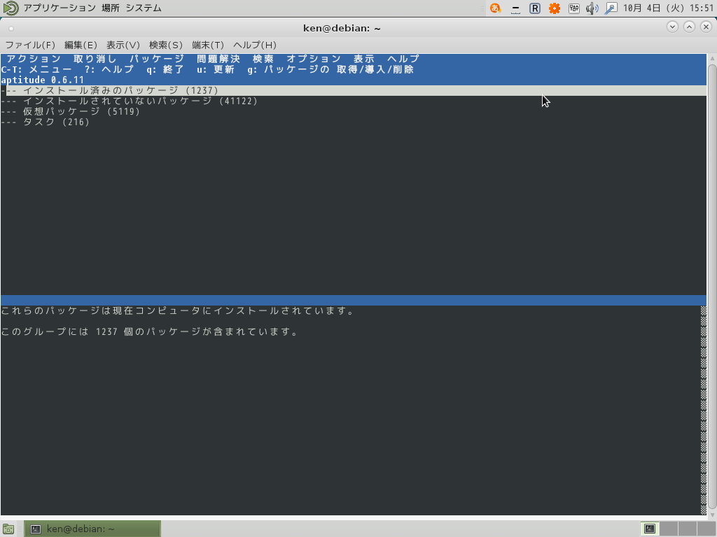 aptitudeに何も引数を与えずに起動すると対話的なCUI画面が表示される。