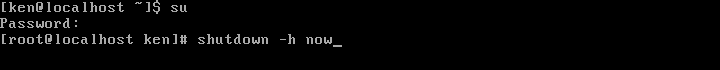 シャットダウンするには「shutdown」コマンドを使用する。root権限で実行すること。基本的に「shutdown -h now」と入力すれば即時シャットダウンが開始される。なお「shutdown -r now」とすると再起動するようになっている。