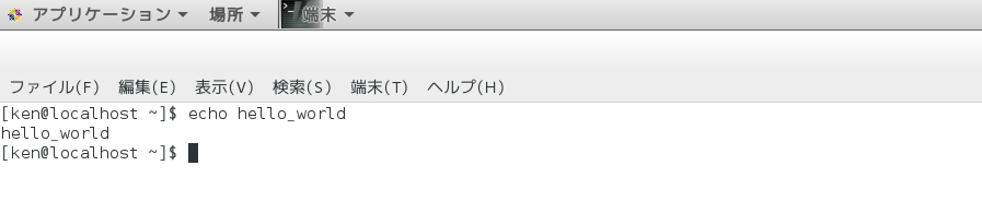 - 「echo」コマンドを使用して「hello_world」と表示してみよう。