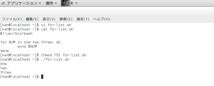 - 「for-list.sh」というファイルを作成し、「for」文を使用して文字列「one two three」をリスト表示してみよう。
