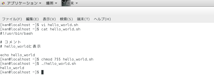 シェルスクリプトを実行して「hello_world」と表示する場合