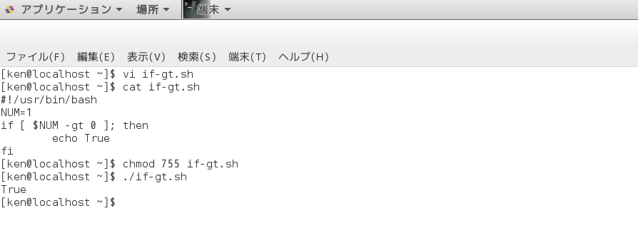 - 「if」文を使用して条件分岐してみよう。「if-gt.sh」を作成し「$NUM」の値が0より大きければ「True」と表示させてみよう。