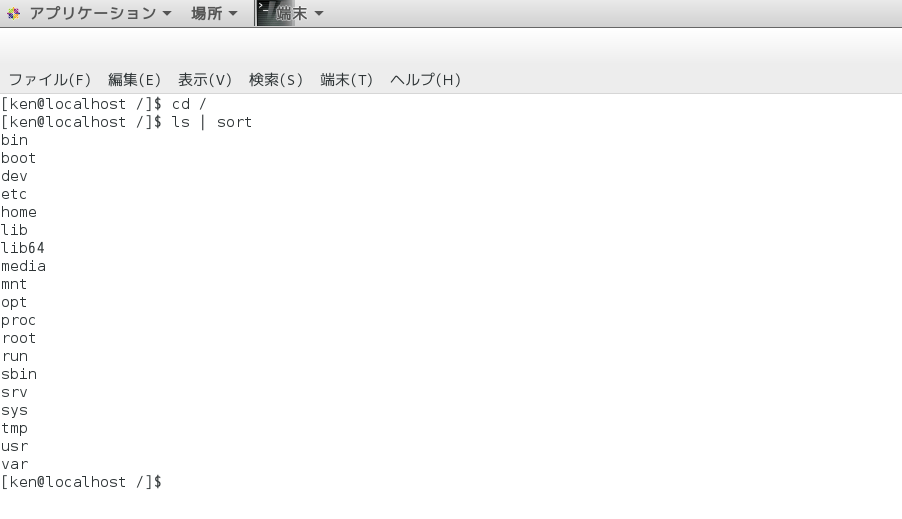 - パイプを使用してみよう。「ls」コマンドの結果をパイプで「sort」コマンドへ繋ごう。