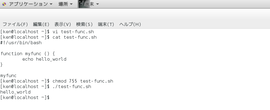 - 「test-func.sh」というファイルを作成し、「hello_world」と表示する「myfunc」という関数を作成して実際に「myfunc」を呼出してみよう。
