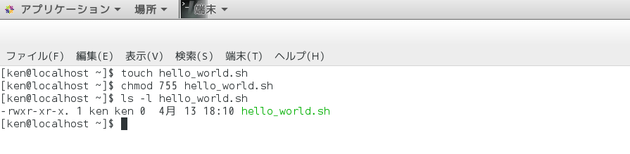 touchもしくはエディタなどで作成したファイルを、スクリプトとして実行するには実行権限を与える必要がある。「chmod 755 hellow_world.sh」とするのが一般的だ。もしくは他人に実行されたくない場合は「chmod 700 hellow_world.sh」とするとよいだろう。