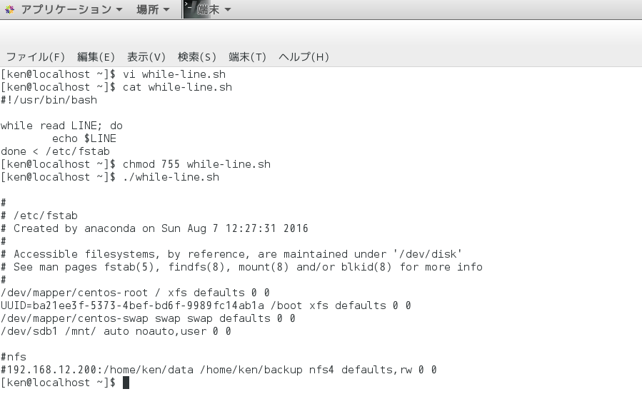 - 「while-line.sh」というファイルを作成し「while」文と「read」文を組み合わせて「/etc/fstab」の中身を一行づつ表示してみよう。