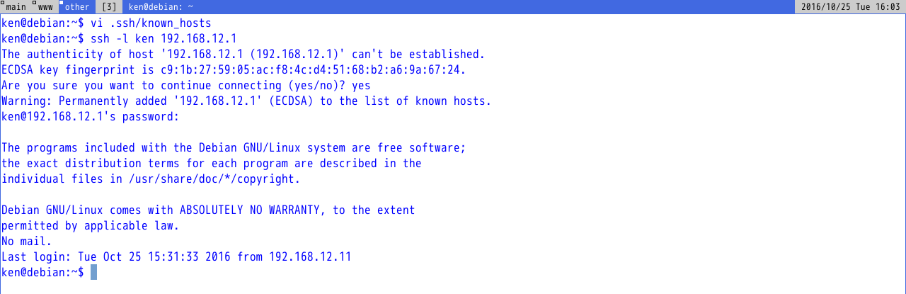 ここでは「Yes」と回答する。すると「~/.ssh/know_hosts」に情報が記録されるため、二回目以降はこの質問がされることはない。いきなりユーザパスワードを求められるようになる。