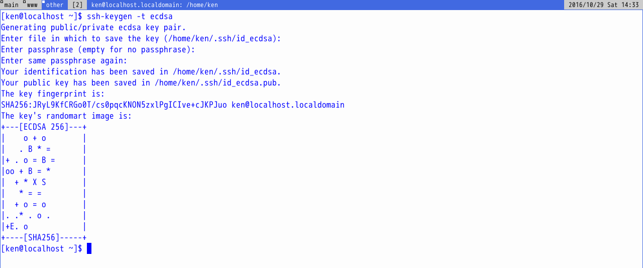 デフォルトでは「/home/<ユーザ名>.ssh/」の下に鍵のペアが生成されるはずだ。ssh1以外は「id_<鍵タイプ>」が秘密鍵であり、「id_<鍵タイプ>.pub」が公開鍵である。ssh1の場合「identity」が秘密鍵、「identity.pub」が公開鍵となるが、ssh1は使用しないようにしよう。