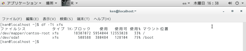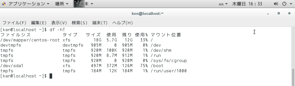 すると以下のようになる。オプション「-h」でみやすい単位に変換されて表示されているのがわかる。「-T」を指定すると「マウントしているデバイスのファイルシステムが何か?」を確認出来る。