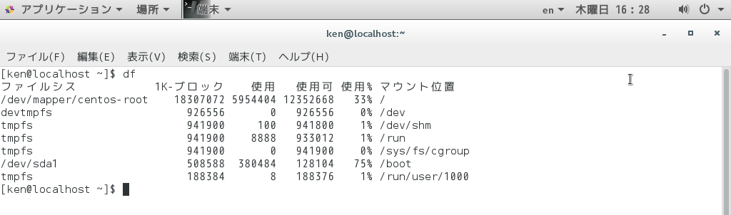 ディスクの空き容量と使用している分量の全体を把握するためのコマンドで、ディスクの空き容量やどういったファイルシステムを使用しているかが確認が出来る。