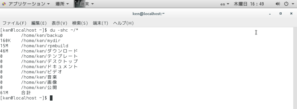 「-s」各引数の合計容量のみ表示する。つまり今回は「ホームディレクトリ直下にあるディレクトリ」の容量となる。