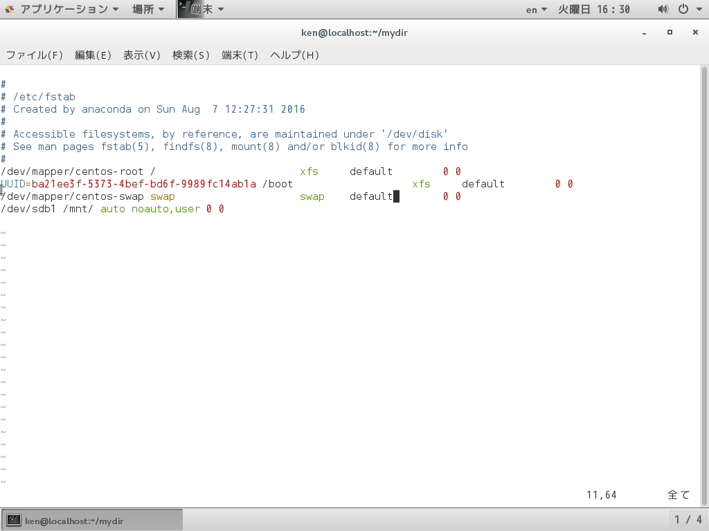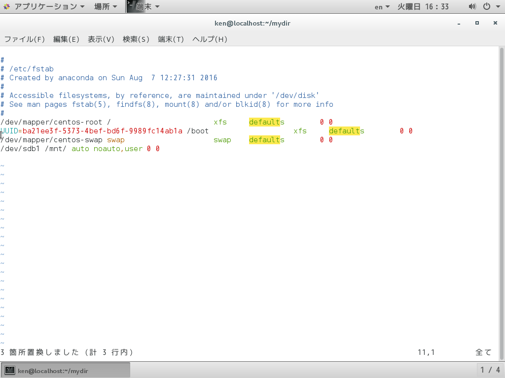 fstabを開いてみた。通常あり得ないが、例として「defaults」になるべき部分が「default」となっている。正しい表記に正規表現を交えて置換してみよう。