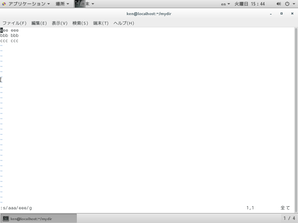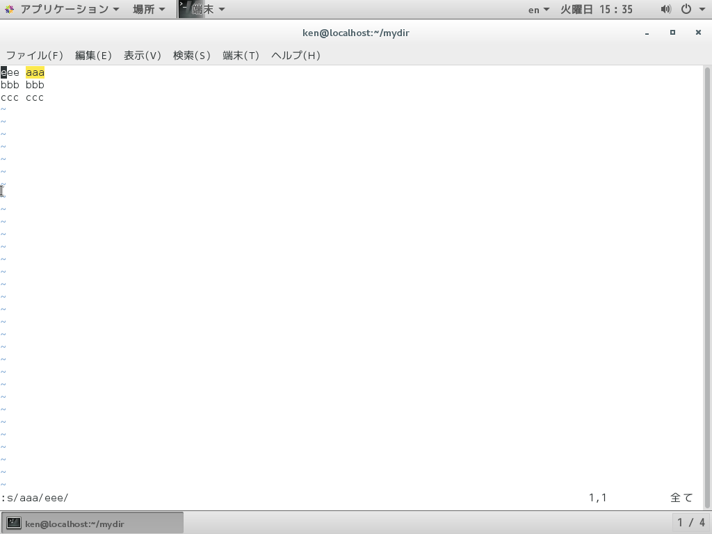 「aaa」にカーソルを置いた状態から「ccc」を「eee」に置換した。