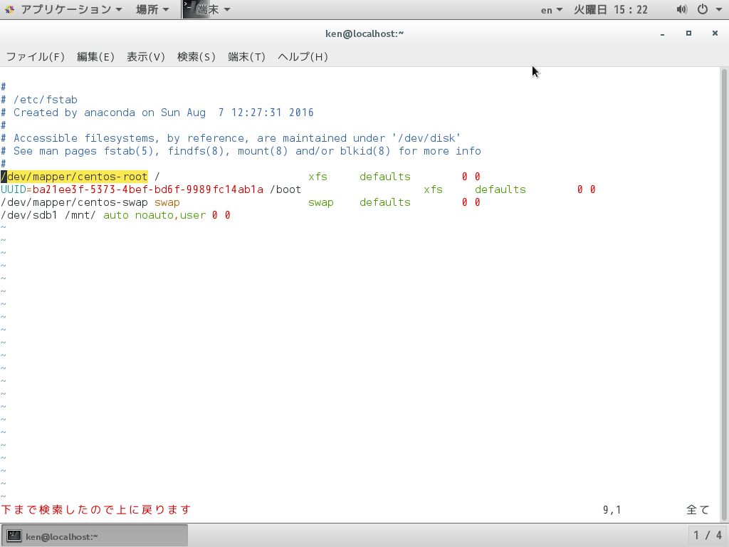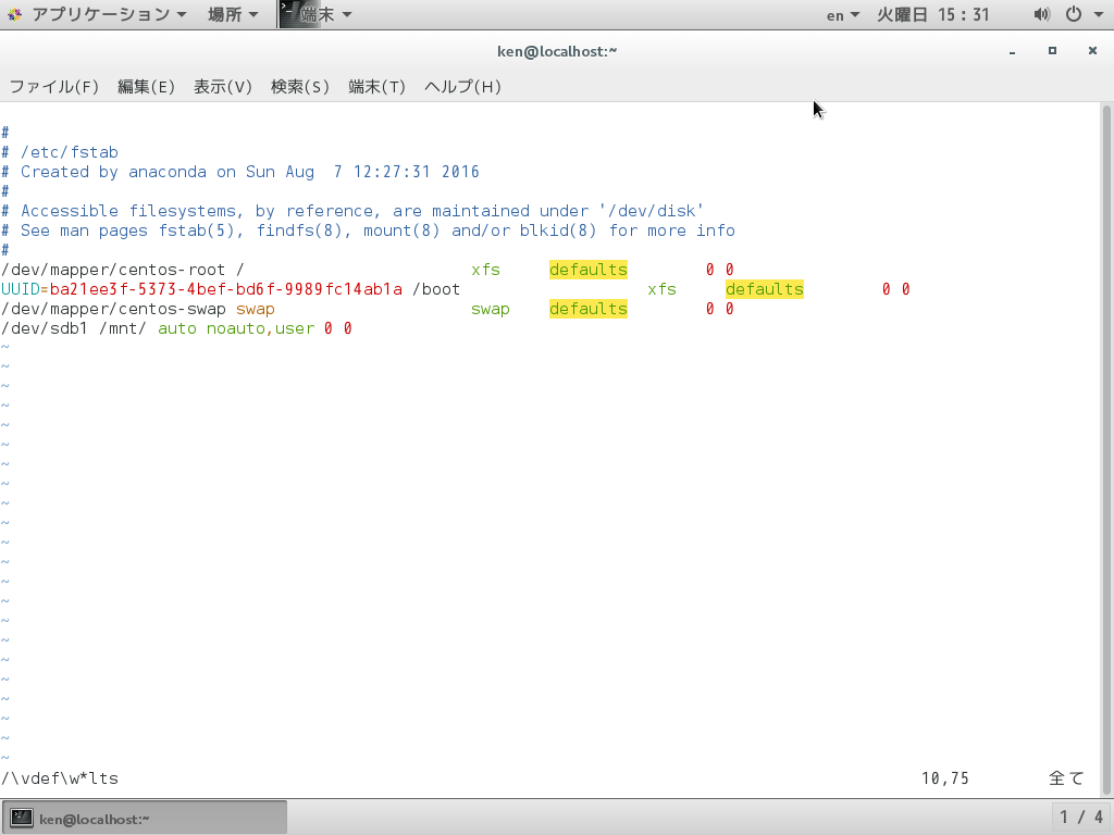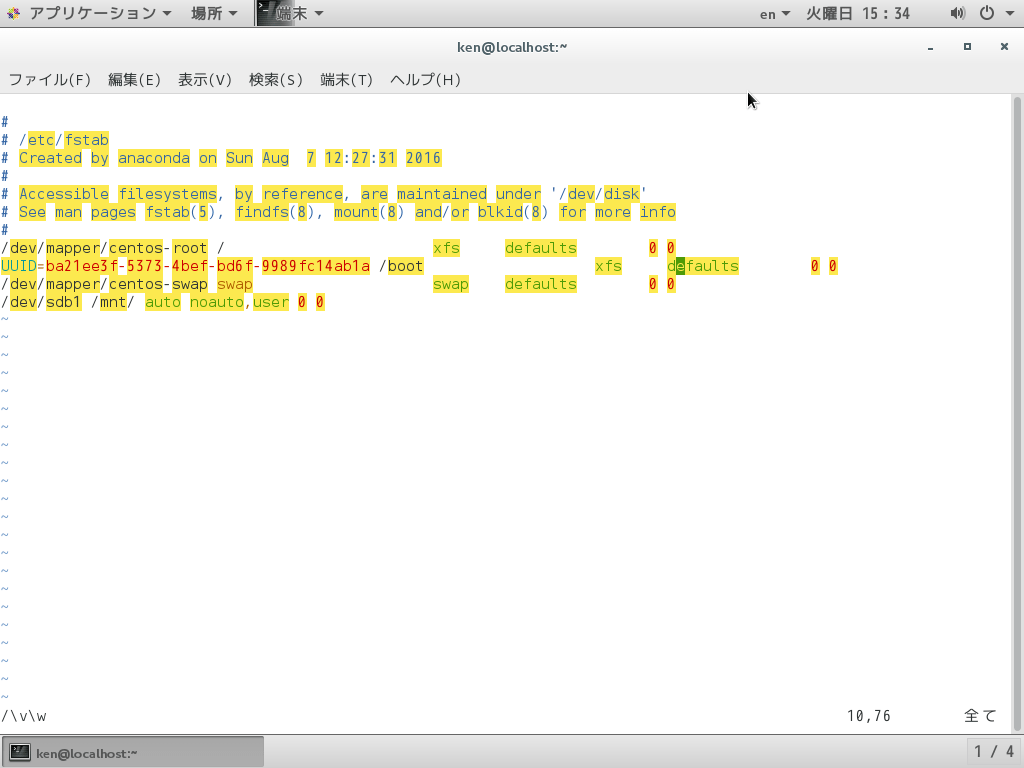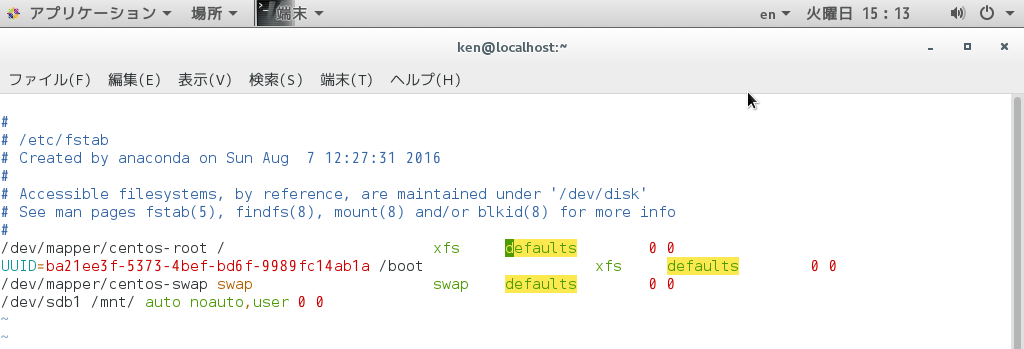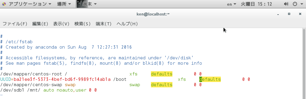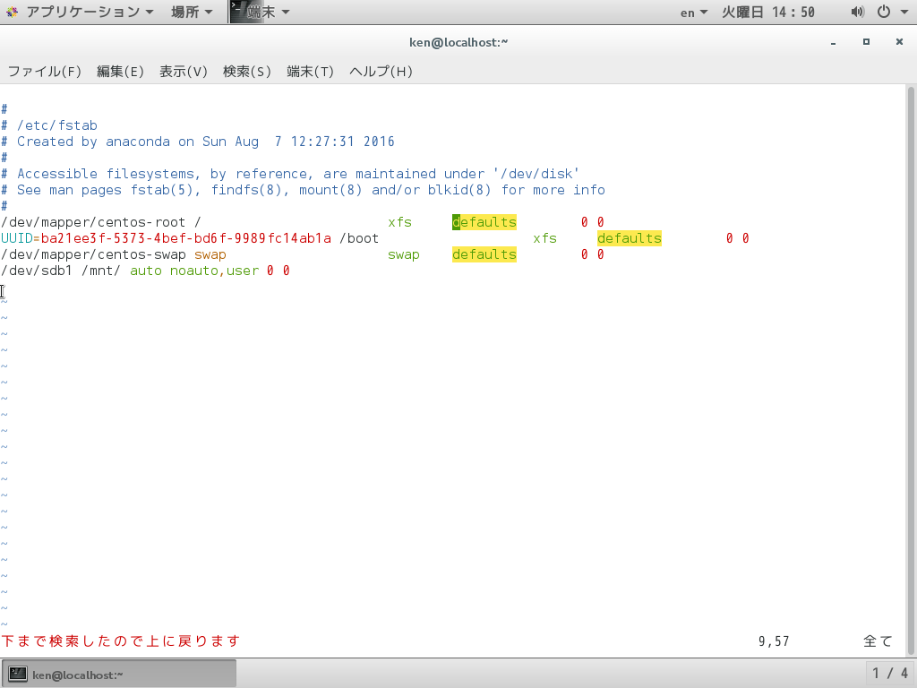 試しに「/etc/fstab」ファイルを開いて「defaults」というキーワードを検索してみる。