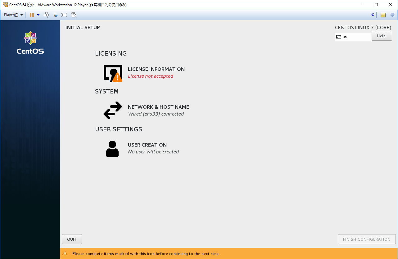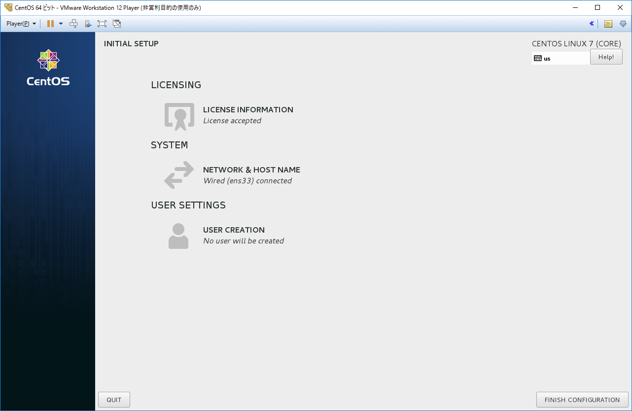 ここまで来たら完了を待つだけだ。インストールが完了すると再起動がかかりCentOS7の初期手続きが始まる。