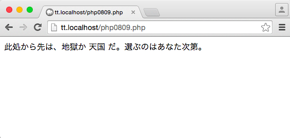 <?php $str = "天国"; echo "此処から先は、地獄か $str だ。選ぶのはあなた次第。"; |