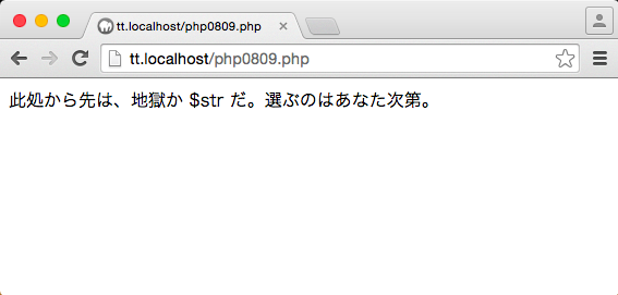 <?php $str = "天国"; echo '此処から先は、地獄か $str だ。選ぶのはあなた次第。'; |