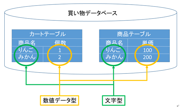 データ型とは、テーブルを構成する列に保存できるデータの種類だ。例えば、買い物データベースの中にカートテーブルと商品テーブルがあったとする。商品名の列は商品の名前の文字を保存するので、データ型は文字型だ。また、個数や単価は数値を保存するので、データ型は数値データ型だ。
