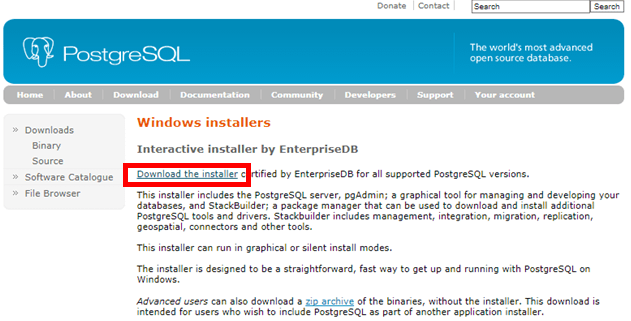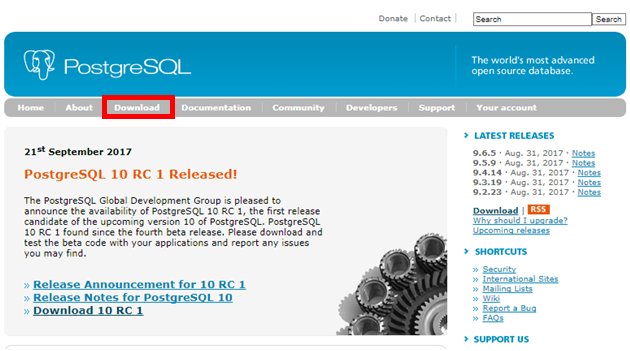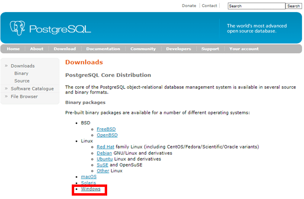 まず行なうことは、PostgreSQLの公式サイト(URL: https://www.postgresql.org/)からインストーラーのダウンロードすることだ。