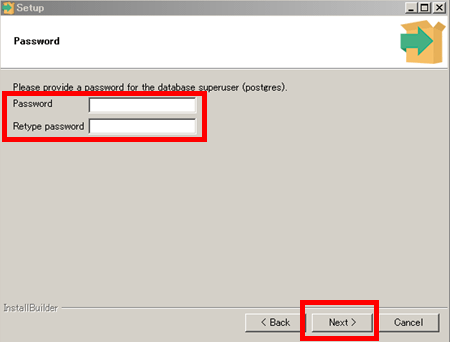 Password画面が表示されたら、データベースのスーパーユーザ(postgres)のためのパスワードを入力する。確認のためにPasswordに続いて同じPasswordをRetype passwordにも入力する。