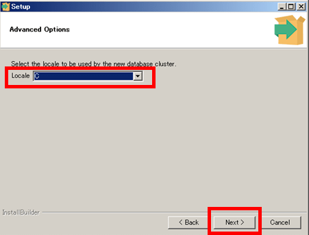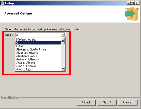 Advanced Optionが表示されたら、Locale(ロケール)をクリックしてメニュー・リストの中から推奨されているCを選択する。