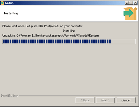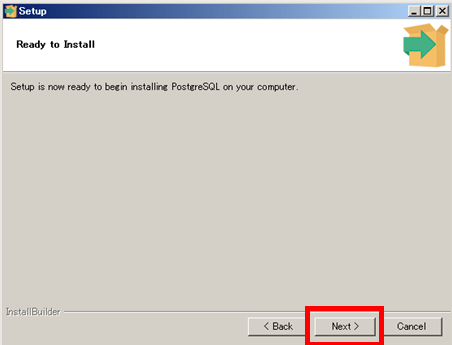 Ready to Install画面に「 Setup is now ready to begin installing PostgreSQL on your computer.」が表示されれば、これでインストーラーのための設定データの入力は全て完了だ。