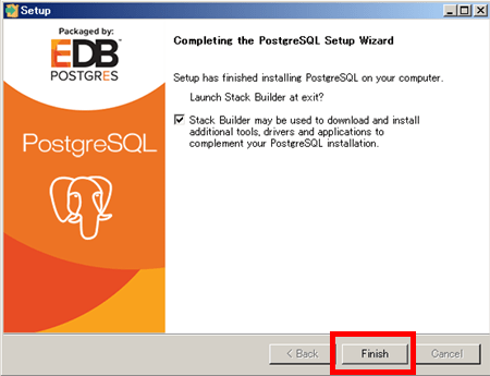 Setup画面に、メッセージ:「Completing the PostgreSQL Setup Wizard」が表示されればインストールは完了だ。最後にFinishボタンを押す。